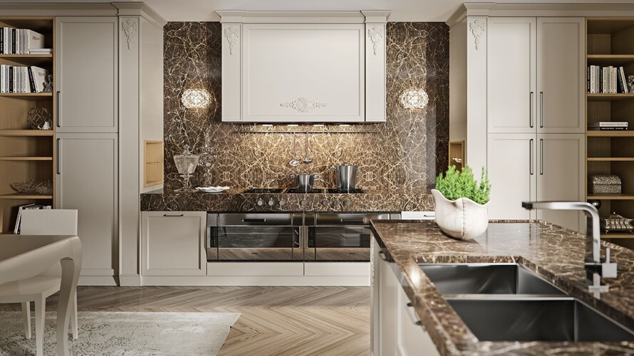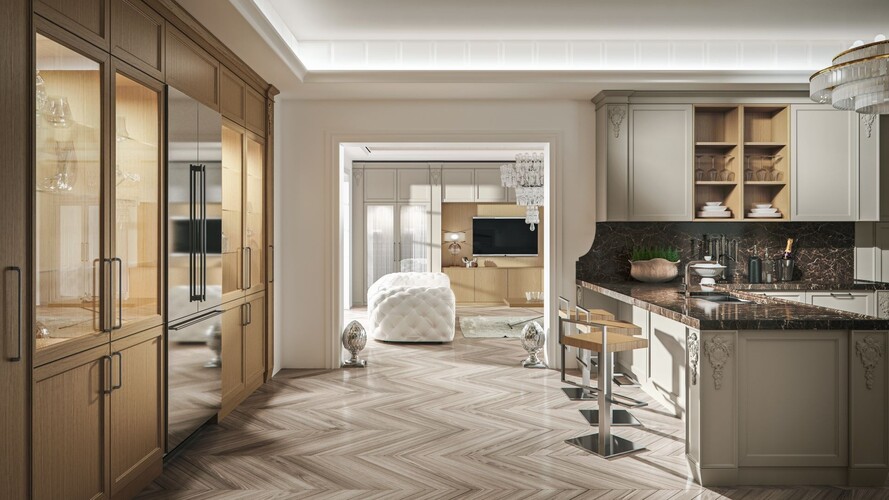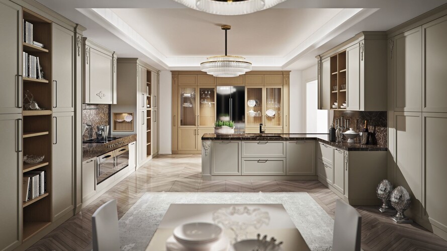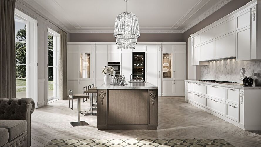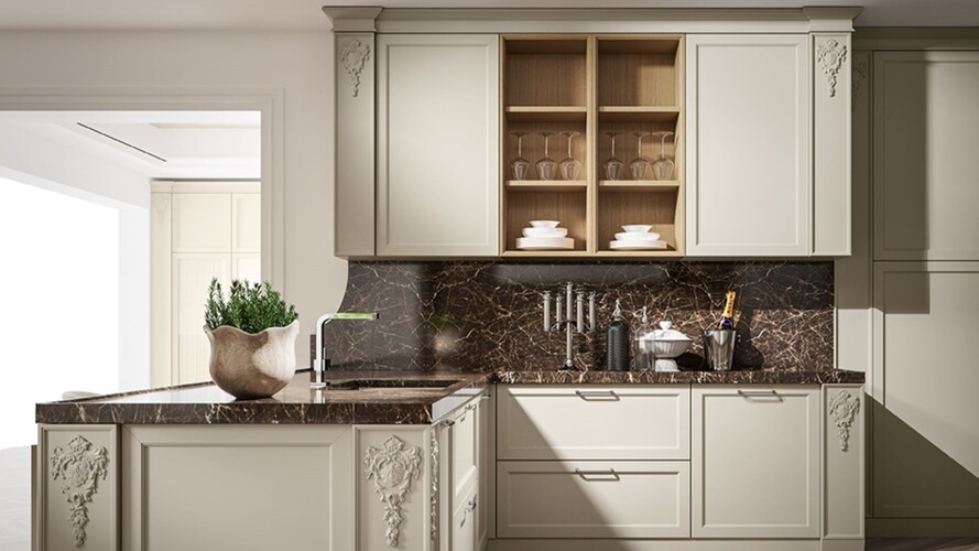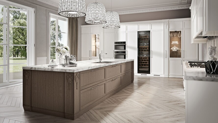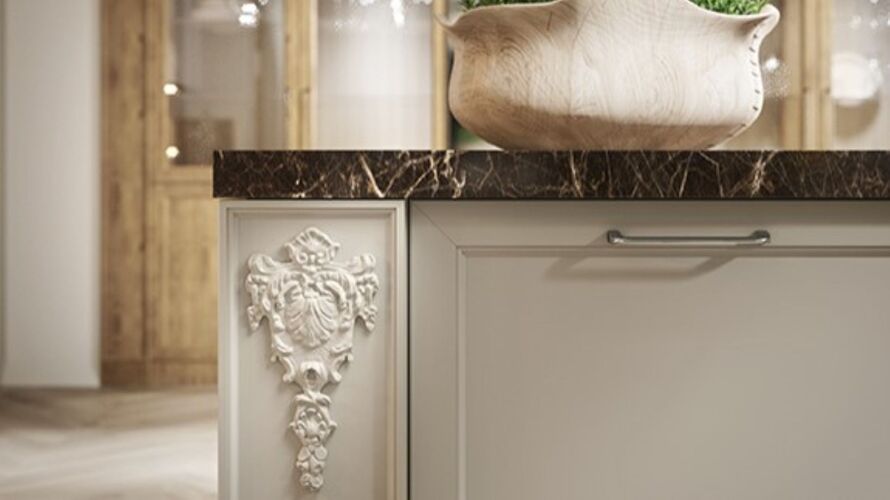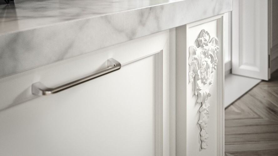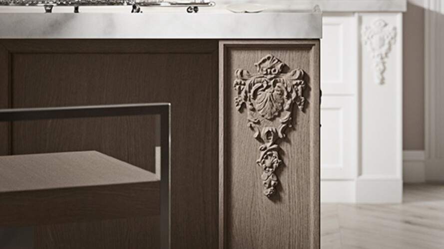 Maya, cucina con anta telaio elegante e fine, abbinata al motivo floreale del fregio in rilievo realizzato interamente a mano.
