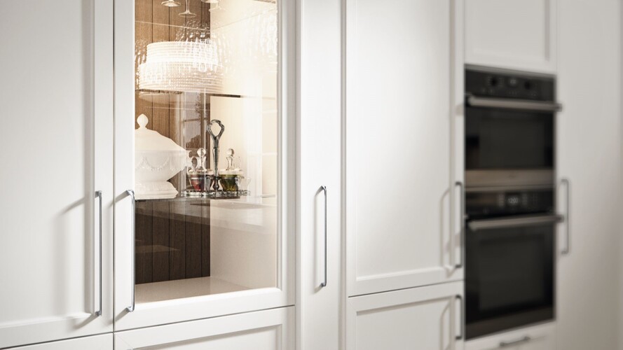 Le colonne con vetrine illuminate internamente accolgono ripiani in cristallo ed uno schienale in rovere fango, dettaglio ricercato per creare armonia tra la finitura dell’isola e quella della cucina.