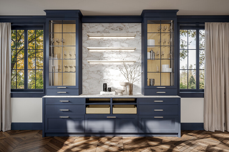 L'isola centrale integra sedute eleganti e leggere e si distingue per presenza e solidità. La sequenza di vetrine scandisce la parete con eleganza e ritmo, mettendo in mostra oggetti e cristallerie con discreta raffinatezza. Il piano in marmo dona continuità visiva e materica completando la composizione con stile e armonia.