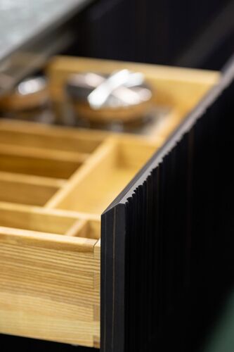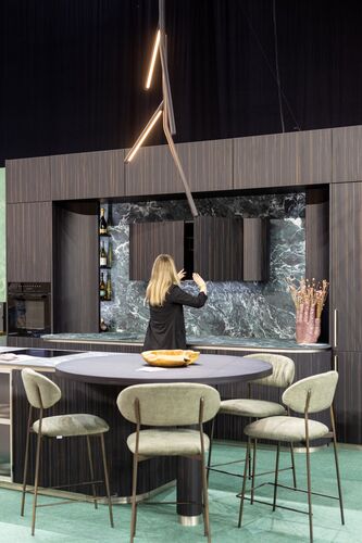 L’elemento chiave di questa collezione è l'isola, che non solo funge da spazio operativo con piano cottura ad induzione, ma è stata anche progettata come un'area di convivialità e relax. Il tavolo rotondo incorporato ospita comodamente fino a quattro persone, creando così un ambiente accogliente e socializzante.
