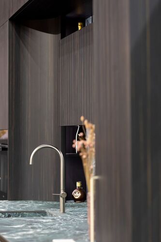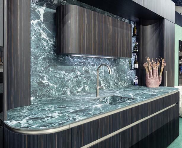 La scelta dei materiali è stata curata nei minimi dettagli: il piano top e lo schienale in materiale Sapienstone verde alpi conferiscono personalità alla cucina, mentre il lavello rivestito con lo stesso materiale aggiunge un tocco di coesione stilistica.